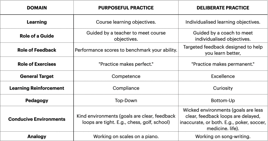 Table Comparing Purposeful Practice and Deliberate Practice.